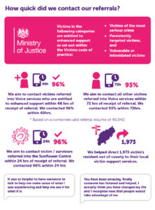 How quick did we contact our referrals? Victims in the following categories are entitled to enhanced support as set out within the Victims code of practice; • Victims of the most serious crime • Persistently targeted victims; and • Vulnerable or intimidated victims We aim to contact victims referred into Voice services who are entitled to enhanced support within 48 hrs of receipt of referral. We contacted 96% within 48hrs. We aim to contact all other victims referred into Voice services within 72 hrs of receipt of referral. We contacted 93% within 72hrs. * Based on a combined valid referral volume of 40,040. We aim to contact victim / survivors referred into the Sunflower Centre within 24 hrs of receipt of referral. We contacted 96% within 24 hrs We helped direct 1,973 victim’s resident out of county to their local victim support services. “It was so helpful to have someone to talk to help me make sense of what I was experiencing and help me see it for what it is.” “You have been amazing, finally someone has listened and helped, I actually think you have changed my life and I recognise now that people would take advantage of me”
