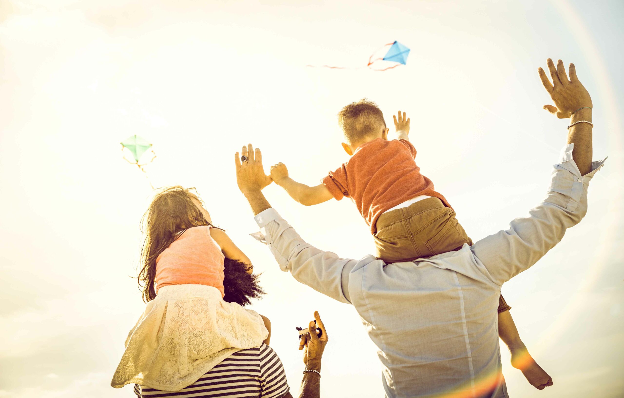 Happy multiracial families group with parents and children playi